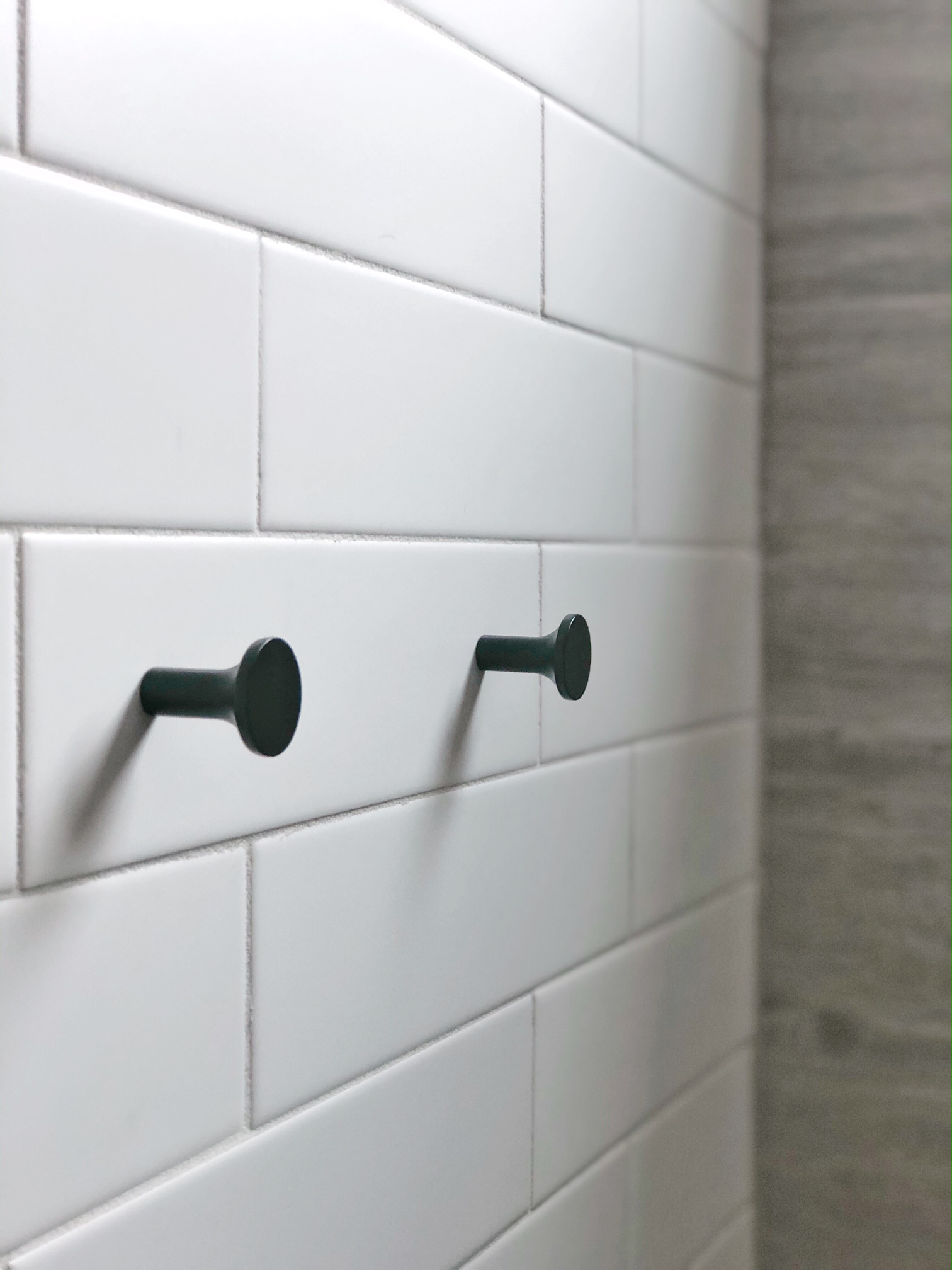 La paleta combina accesorios en acabado negro, azulejos blancos tipo subway, elegidos por su versatilidad y atemporalidad, y una cerámica española de la firma 41zero42, seleccionada por su carácter gráfico y sofisticado. Este material fue especificado a través de Mosagres, proveedor local en Panamá.