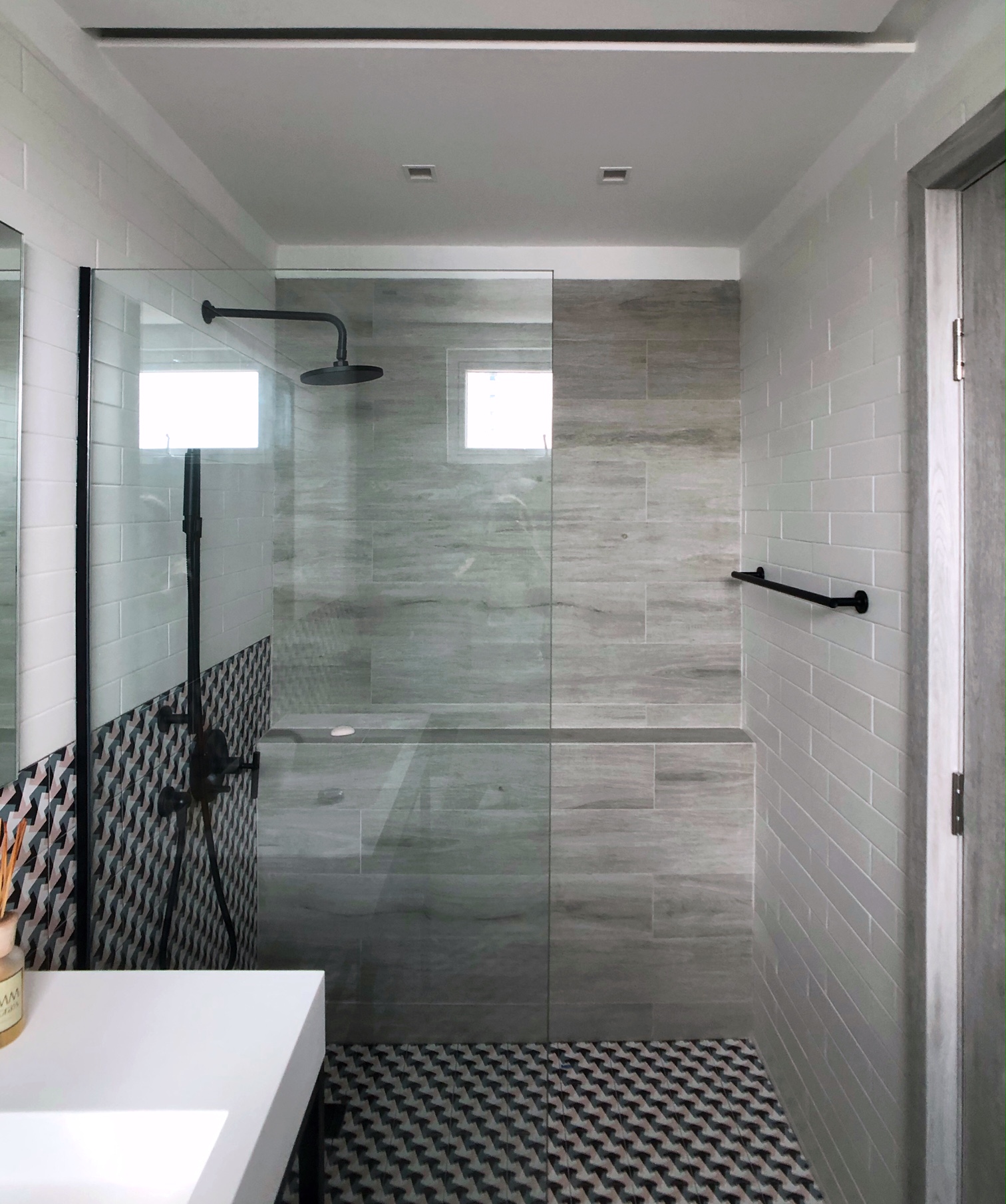 The design combines black-finished accessories, classic white subway tiles—selected for their timeless versatility—and high-quality Spanish ceramic tiles, chosen for their graphic precision and long-term performance. This material palette creates contrast while maintaining visual balance.
